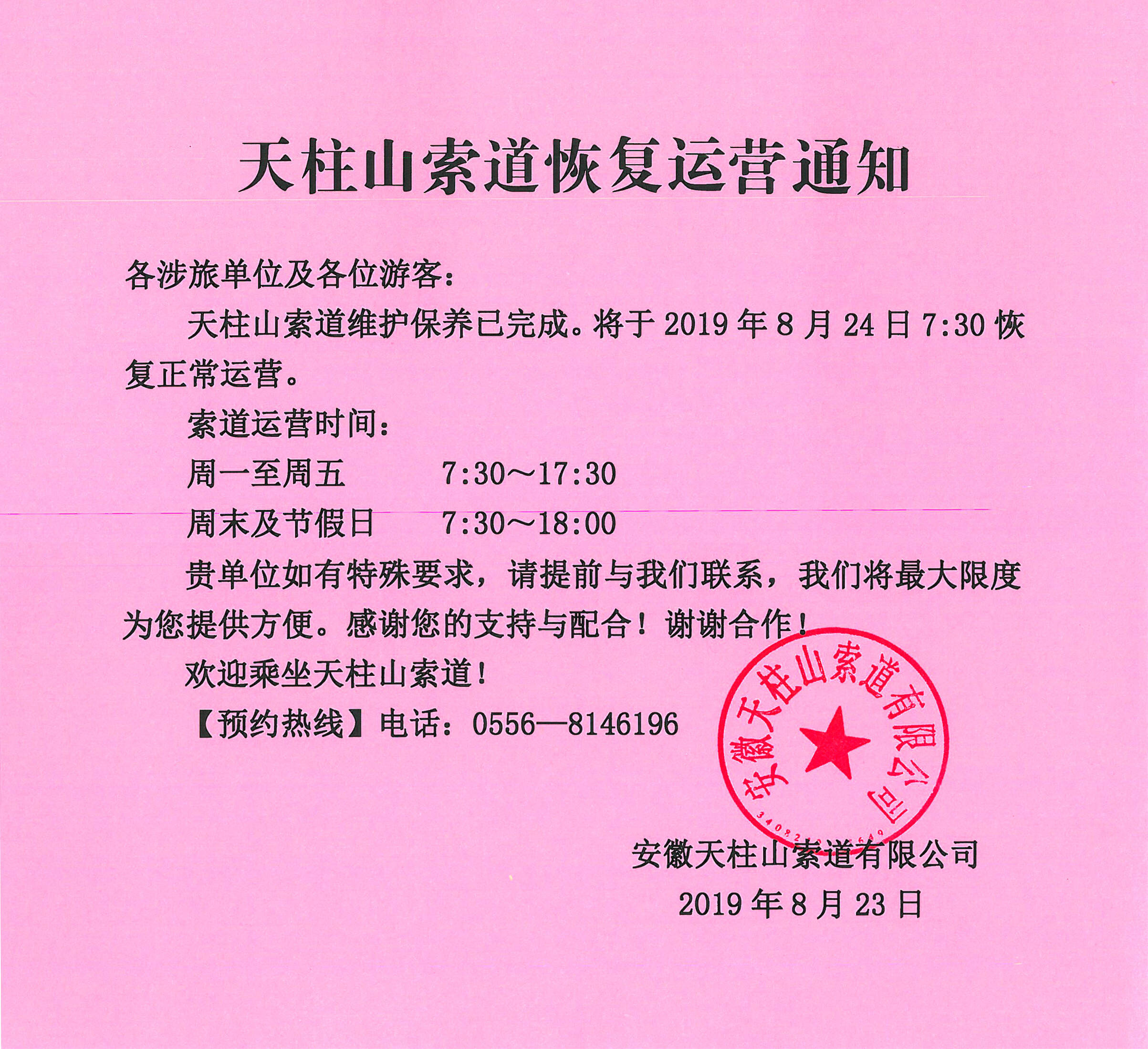 關于天柱山索道恢復運營的通知