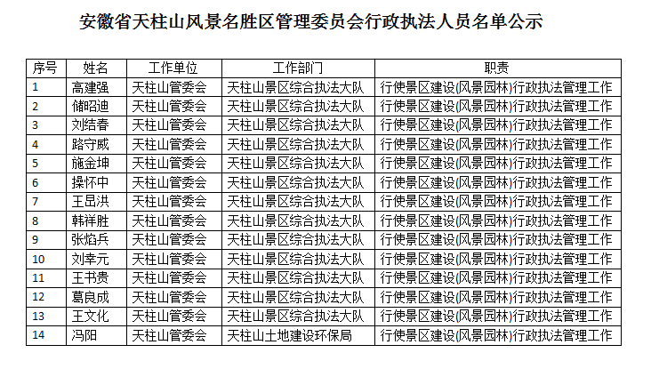 安徽省天柱山風景名勝區(qū)管理委員會行政執(zhí)法人員名單公示