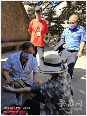 在休憩過(guò)程中,李女士低血糖犯了,倍感難受。天柱山工作人員張銳發(fā)現(xiàn)她狀況不對(duì),上前溫馨詢(xún)問(wèn)并熱情帶領(lǐng)她找到景區(qū)醫(yī)療人員,測(cè)量血壓,喝了一支葡萄糖。李女士的低血糖得到及時(shí)補(bǔ)充,休息一段時(shí)間后,精神緩和,體力恢復(fù)。在張銳的陪伴鼓勵(lì)下,李女士堅(jiān)持攀登到天柱山天池峰之巔,親自拍下了雄偉神奇的天柱山主峰影像。