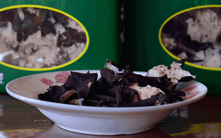 屬地衣門石耳科,菌體葉狀,正面為灰白或灰綠色,反面為黑褐色,多生長于海拔700-2000米懸崖峭壁的陰濕石縫間。石耳常以小群落的形式分布,少則幾片,多則百余片。一公斤干石耳約1400片左右,因而極其珍貴。石耳的藥用價值很高,《神農本草經》就把它列為上等藥材。其主要成份有氨基酸、卵磷質和多種微金屬元素。有滋陰潤肺、治療高血壓和各種熱癥等攻效,對抑制腫瘤、出血也有積極作用。同時石耳亦可佐菜食用?!笆鸁跫佐~”、“石耳烏雞湯”等乃為上等佳肴。天柱山地處江淮之間,氣候溫和、雨量充沛,終年云霧繚繞,且境內群山環(huán)繞,海拔千米以上的雄峰45座,是石耳生長的理想之地。