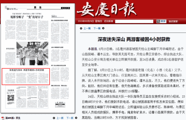 24日,天柱山綜合執(zhí)法大隊一中隊指導(dǎo)員王淼生在接受采訪時介紹說,23日晚8時37分許,他們接到求救電話,遂讓被困游客用手機發(fā)來定位圖,得知他們被困主峰腳下月華峰附近后,立即通知駐山隊員姜喬石、陳崇明,與景區(qū)相關(guān)人員組成救援隊,攜帶手電、繩索和礦泉水,沿著小路展開搜救。由于天黑路險,當(dāng)晚23時30許,方才找到被困者。